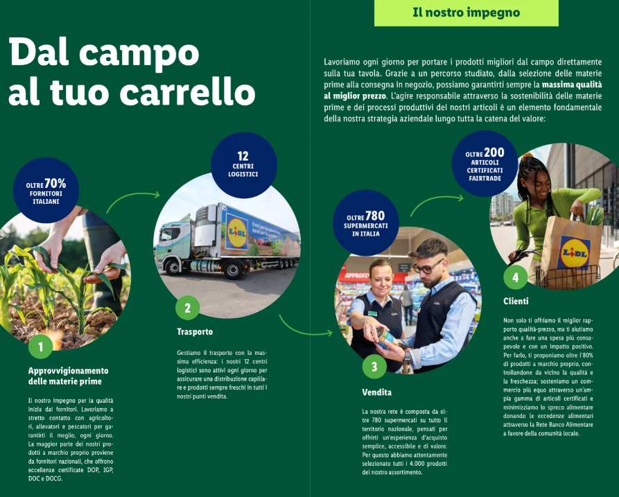 L’obiettivo è da un lato rendere trasparenti i traguardi raggiunti e gli impegni assunti dall’azienda in materia di ESG, mostrando come la sostenibilità si traduca in scelte concrete lungo la filiera e nei prodotti presenti sugli scaffali. Dall’altro, utilizzare la forza distributiva del volantino per spiegare il valore delle decisioni che precedono l’acquisto, rafforzando il ruolo di Lidl come punto di contatto tra produzione e consumatore e promuovendo la conoscenza come primo passo verso un cambiamento dei comportamenti.